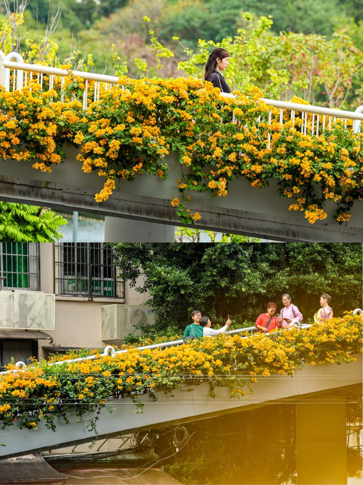 Bougainvillea, blooming from autumn through spring, is one of Guangzhou’sdefining seasonal sights. Pedestrian bridges, overpasses, and streets become vibrant “flower corridors.” At Wuyang New Town Pedestrian Bridge, blossoms cascade like a floral curtain; near Chigang Metro Station, orange-red blooms frame views of Canton Tower; and don’t miss the rare pale-yellow variety at the exits of Caihong Bridge Metro Station!