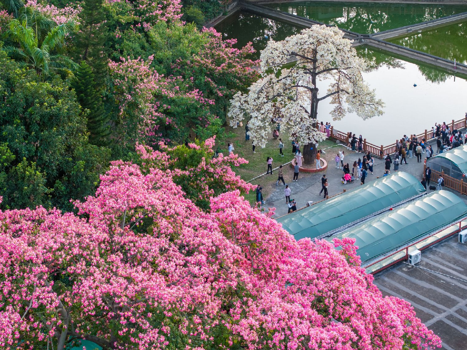 Across Guangzhou,silk floss trees burst into soft pink blooms that last into January. At Luhu Park, dense clusters form rosy clouds above shaded walkways. Along Tram Haizhu Line 1, blossoms drift past the windows like a moving dreamscape. For a rare sight, head to South China Normal University’s Shipai Campus to see a white silk floss tree, its snow-like flowers bringing a serene touch to Guangzhou’swarm winter.
