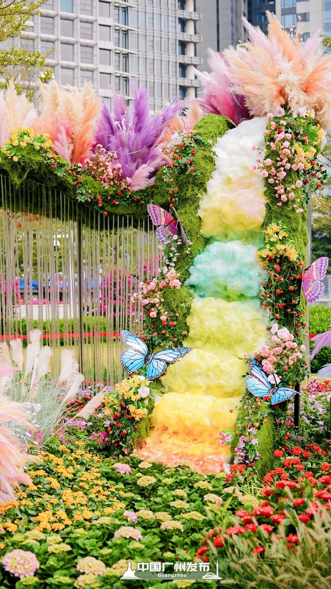 To celebrate the National Games, a dedicated National Games Garden has been established at Haixinsha, where mascots from past editions are transformed into playful topiary artworks. Other highlights include a giant cascading floral bouquet on Linjiang Avenue, a “bow-knot skirt” installation in Hongcheng Park, and a towering kapok-themed structure at Huacheng Square.