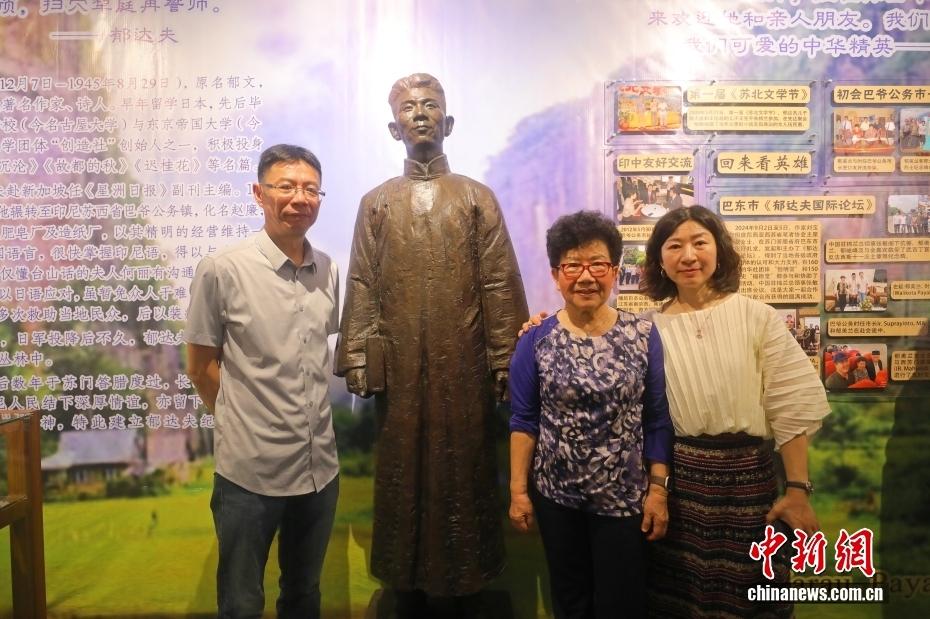 当地时间12月1日,郁达夫纪念馆开幕仪式在印度尼西亚苏门答腊棉兰举行。纪念馆正中央矗立着郁达夫铜像。展厅一侧的整面展墙按“家园”“婚姻”“求学生涯”“文学创作”“抗战时期”“流亡印尼苏岛”等板块展开,系统呈现郁达夫的一生。图为郁达夫长孙郁峻峰(左)、郁达夫女儿郁美兰(中)、郁美兰女儿胡雁(右)在铜像前。中新社记者 李志全 摄