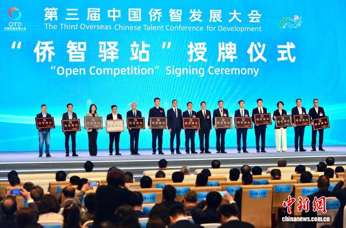 12月1日,第三届中国侨智发展大会在福建福州正式开幕。本届大会以“五洲聚福汇侨智·同心共圆中国梦”为永久主题,以“侨汇天下才·智创新时代”为年度主题,汇聚海内外侨界英才、专家学者、侨商侨领及企业代表等共话合作、共谋发展。图为活动上举行首批“侨智驿站”授牌仪式。中新社记者 张斌 摄