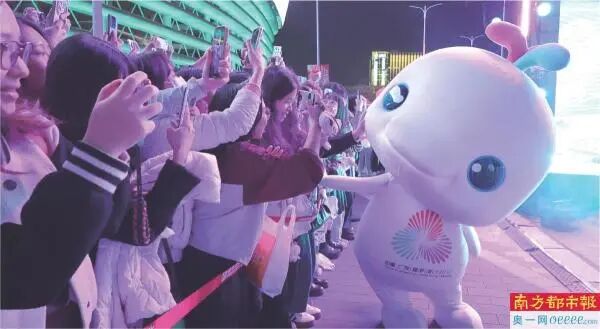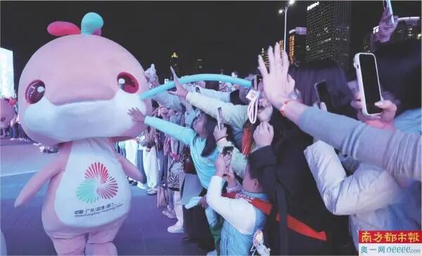 11月20日,广州国际灯光节“全运宝宝游花城”环节,十五运会吉祥物与观众热情互动。 高永佳 摄