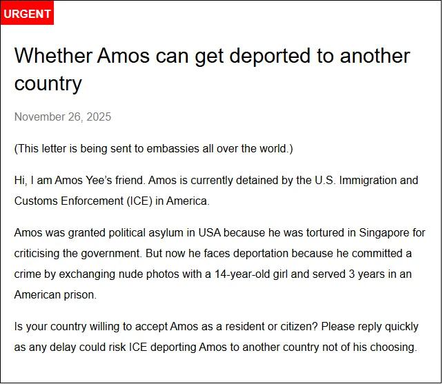 最近,新加坡问题少年余澎杉(AmosYee)的个人网站上发布了一条“紧急”消息,他的朋友代他向全球大使馆求助,希望有其他国家可以收留他。消息发布以后,立刻引来全网群嘲。