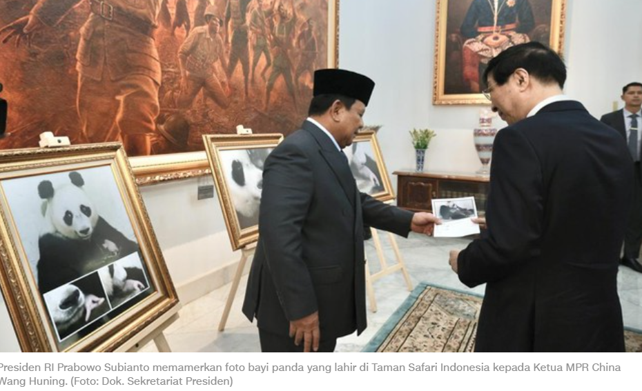 在正式会谈期间,普拉博沃总统向王沪宁主席特别展示了一张新生大熊猫幼崽的照片,为会晤增添了友好氛围。