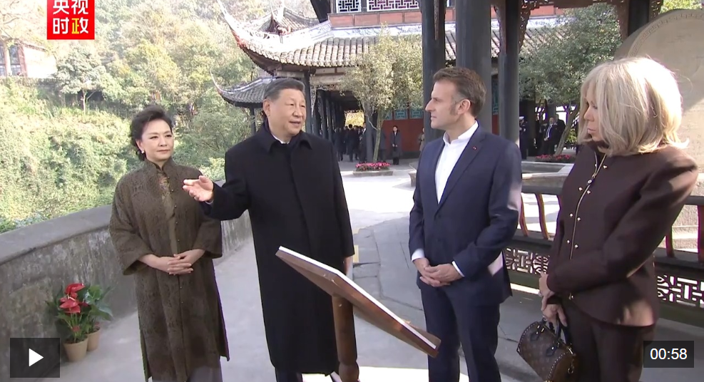 初冬的都江堰,苍山掩翠。马克龙夫妇抵达时,受到习近平和彭丽媛热情迎接。习近平欢迎马克龙到访“天府之国”,表示去年你邀请我赴你的家乡上比利牛斯省,相信你此行会进一步丰富对中国的认知。