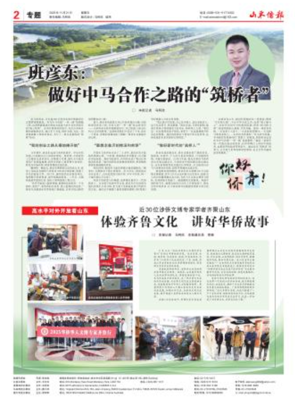在班彦东心中,新时代侨胞肩负三重使命:既要“守住根与魂”,不忘中华文化之本;也要“敢于破与立”,在时代变局中寻找新的机遇;更要“担当桥与梁”,促进两国民心相通、合作共赢。他如一座坚实的桥,一头连着个人奋斗,一头系着家国期许;一头扎根马来西亚热土,一头牵挂齐鲁桑梓。“作为青年侨胞,本身就肩负着新时代‘筑侨人’的使命,我的事业也是在为中马共建‘一带一路’筑基搭桥。”他说,“希望年轻一代能扛起这份使命,在世界舞台上讲好中国故事,也把世界的故事带回家乡。通过众多‘筑桥者’的努力,让中国与世界的联结更紧密,也让合作共赢的故事更精彩。”