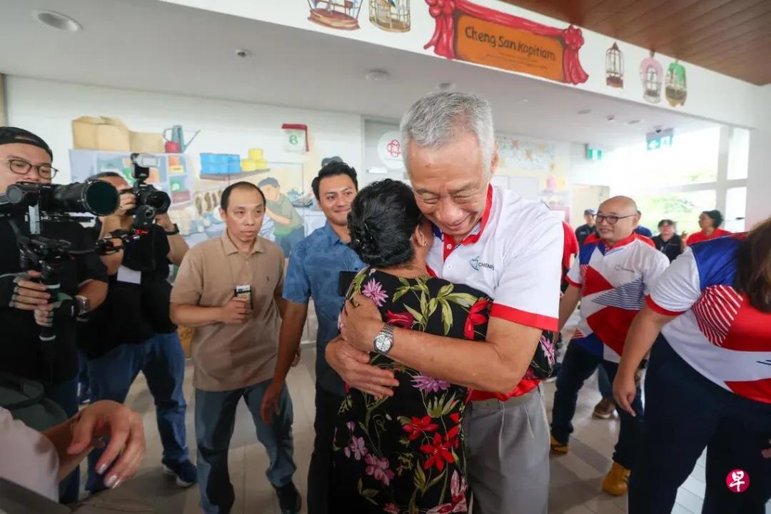国务资政李显龙12月6日上午出席翻新后的静山民众俱乐部开幕活动时,与居民热情拥抱。 (白艳琳摄)