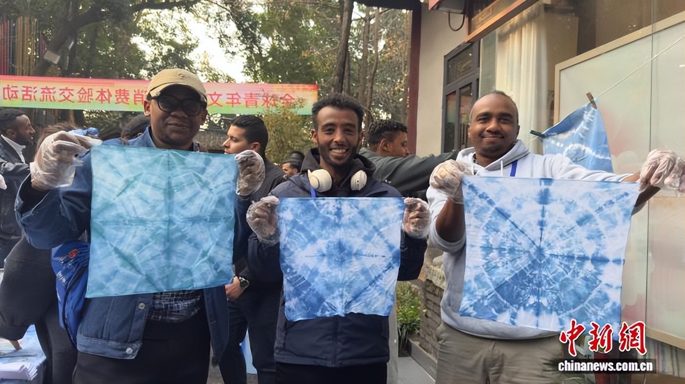 扎染体验区,非洲青年们在老师的指导下认真进行每一道工序——将白色方巾折叠、用工具进行捆扎,再小心将扎好的“布疙瘩”放入染料浸泡以着色,最后取出染好的布料清洗、晾晒……不一会儿,一件件图案各异、色彩斑斓的扎染作品“新鲜出炉”,非洲青年们纷纷与自己的作品合影,脸上洋溢着灿烂的笑容。