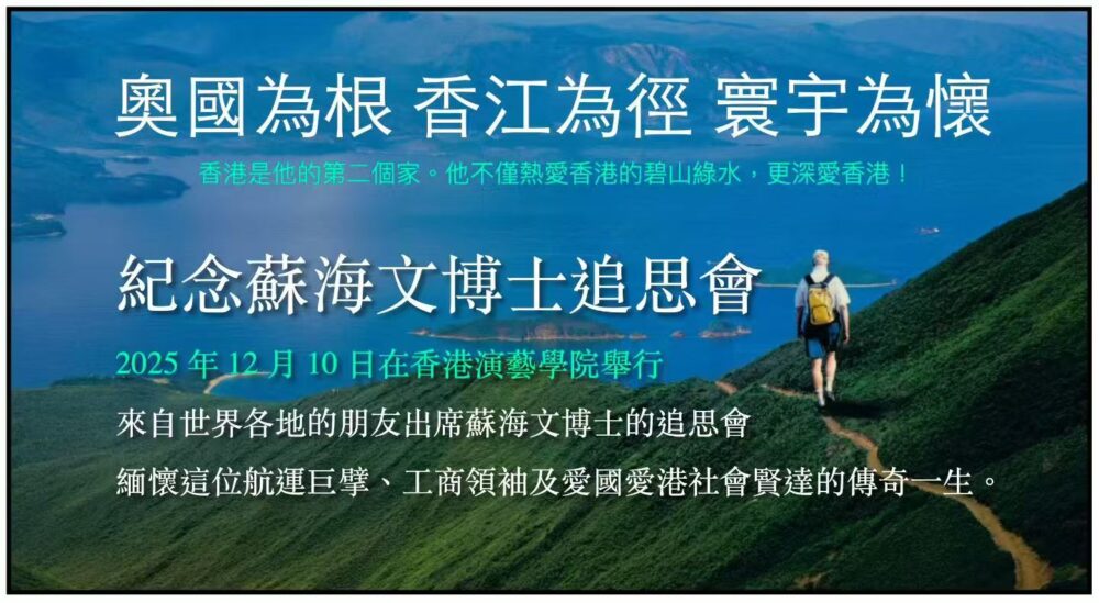 紀念蘇海文博士追思會已於2025 年 12 月 10 日在香港演藝學院舉行。 當日,來自世界各地朋友們蒞臨會場,參加蘇海文博士的追思會,緬懷這位航運巨擘、工商領袖及愛國愛港社會賢達的傳奇一生。
