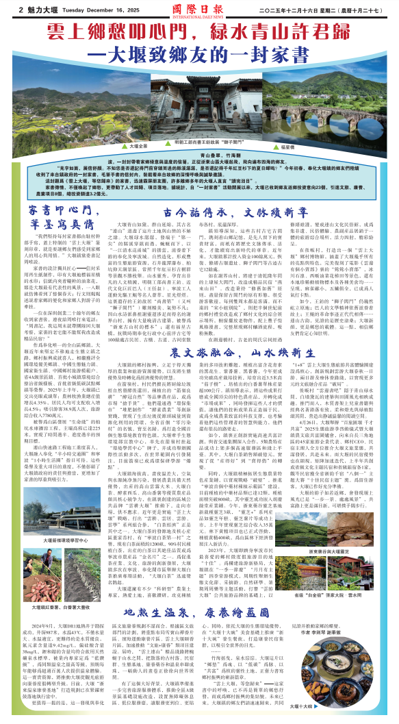 家书传情,不仅唤起了乡愁,更带动了人才回归、项目落地。据统计,自“一封家书”活动开展以来,大堰已收到乡友返乡投资意向23个,引进文旅、康养、农业项目8个,总投资额达3.2亿元。