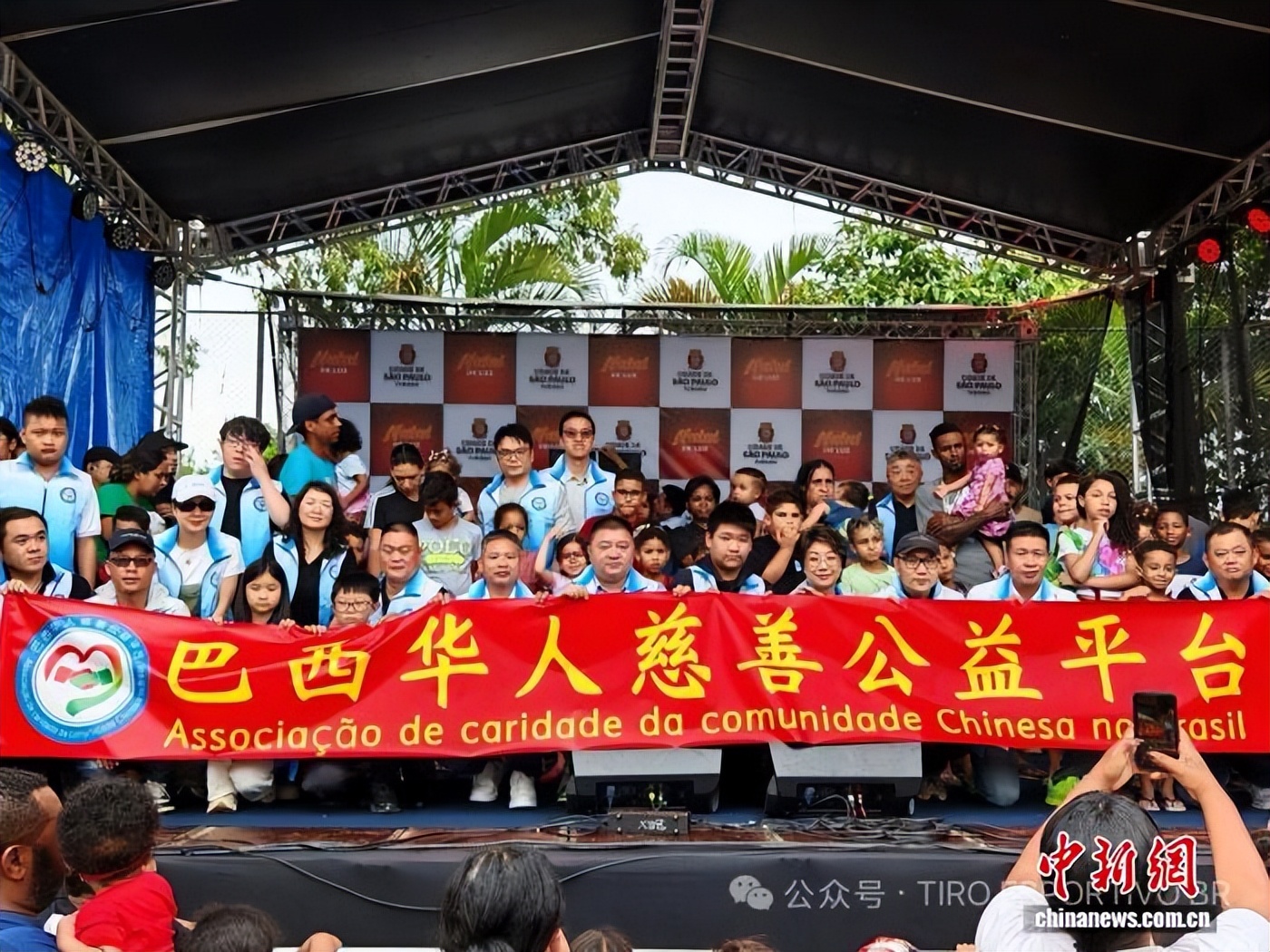 在圣保罗市维拉·巴西利纳社区,中巴慈善基金总会、巴西青田慈善总会、中巴射击协会、巴西金华商会同乡总会、巴西华人华侨羽毛球协会五家侨团联合发起慈善义举。
