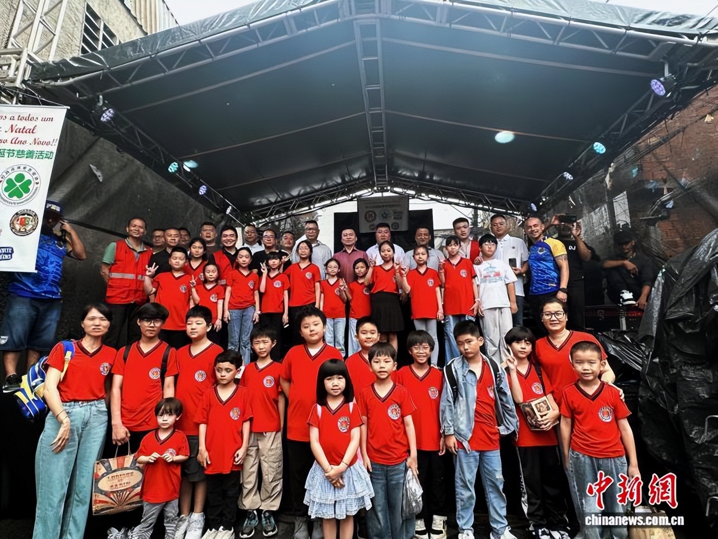 当地时间12月13日,巴西圣保罗一平民社区,中巴慈善基金总会、巴西青田慈善总会、中巴射击协会、巴西金华商会同乡总会、巴西华人华侨羽毛球协会联袂做慈善捐赠活动现场,参与歌舞表演的小侨胞们合影。中巴慈善基金总会供图