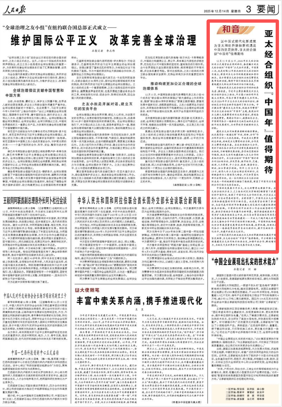 12月14日,《人民日报》第3版的国际评论专栏“和音”,刊发文章《亚太经合组织“中国年”值得期待》。文章说,以中国式现代化新成就为亚太和世界提供新机遇是中国的坚定抉择,亚太经合组织“中国年”值得期待。