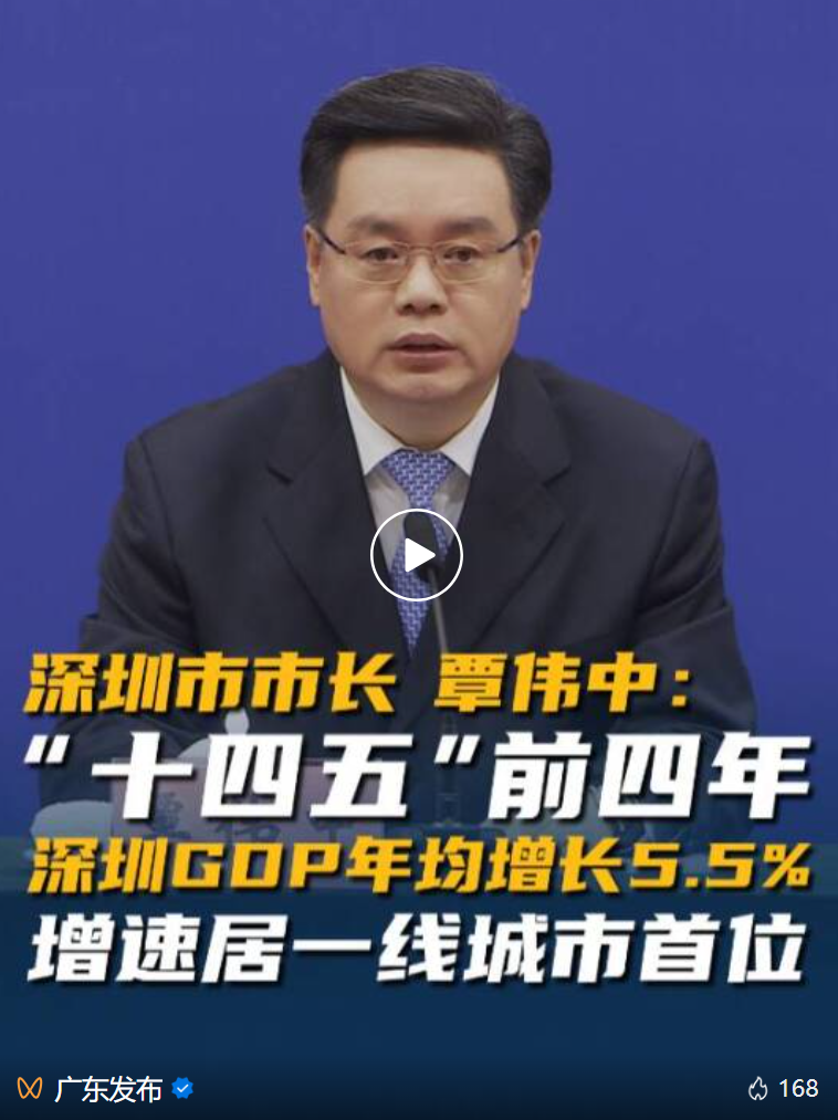 深圳市委副书记、市长覃伟中介绍,“十四五”前四年,全市地区生产总值从2020年的2.78万亿元增至2024年的3.68万亿元,年均增长5.5%、增速居一线城市首位。规上工业总产值、工业增加值从2022年开始保持全国城市“双第一”。“十四五”期间,深圳固定资产投资总额可达4.5万亿元、约为“十三五”的1.5倍。“十四五”前四年,深圳战略性新兴产业增加值年均增长10%以上、占GDP比重提高到42.3%。建成投产11个百亿级大型工业项目,先进制造业和高技术制造业增加值占规上工业比重分别达68.2%、58.2%。国家级专精特新“小巨人”企业数量达1333家、跃居全国城市首位;境内外上市企业592家、瞪羚企业215家、独角兽企业42家,均位居全国前列。