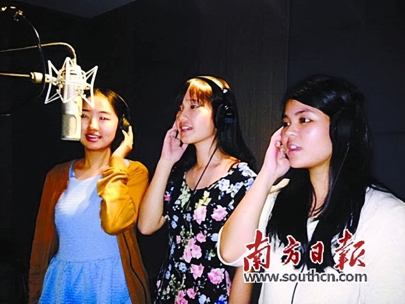 在学校演出获得成功后,霍昱妗(右一)和同伴一起将《桃李芳馨》录制成了唱片