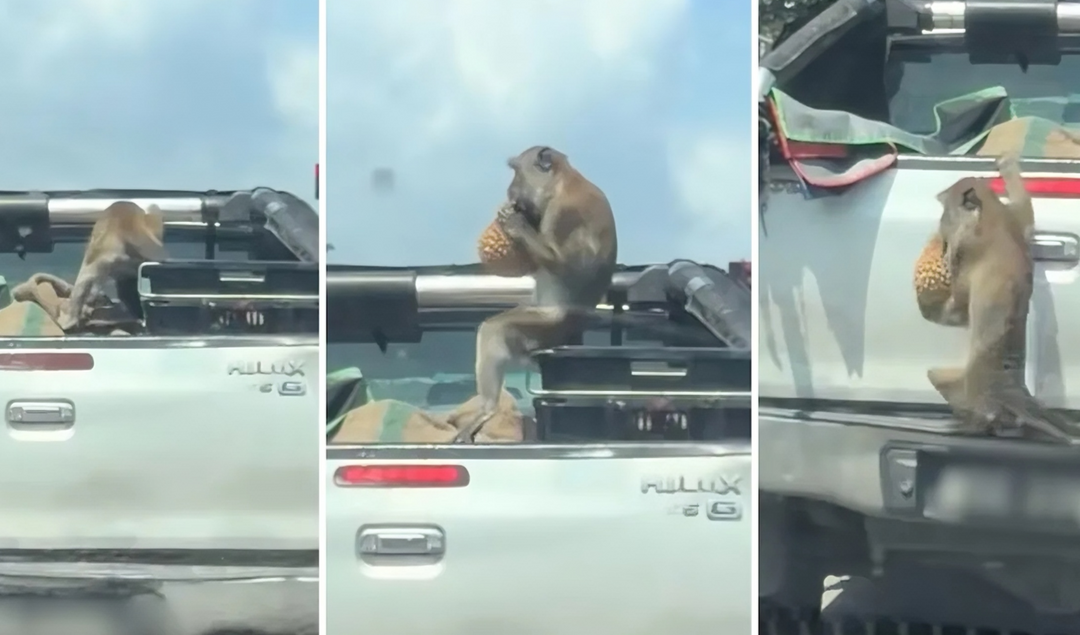 据《中国报》报道,事发时一辆满载榴莲的货车正停在红绿灯前等候通行。就在此时,一只猴子突然从路旁窜出,目标明确地跳上货车后方车斗。后方车辆拍下的TikTok视频画面清晰显示,这只猴子毫不迟疑地掀开覆盖榴莲篮子的麻袋,熟练抱起一颗榴莲后还低头嗅了嗅,仿佛在仔细确认“战利品”无误。
