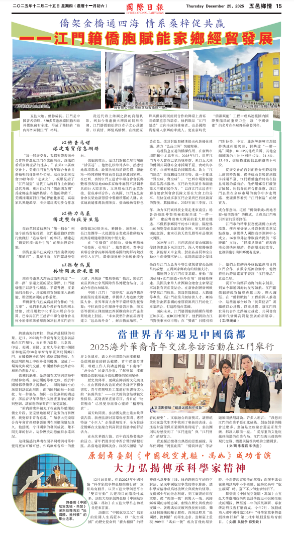 从百年前漂洋过海的艰辛创业,到如今联通四海的从容领航,江门籍侨胞的经贸情缘跨越山海、历久弥坚。在“侨都赋能”工程的深入推进中,这些遍布全球的“民间使者”将继续以心为桥、以商为媒,让江门与世界的合作之路越走越宽,共同书写新时代侨乡高质量发展的新篇章。(文/张茂盛)