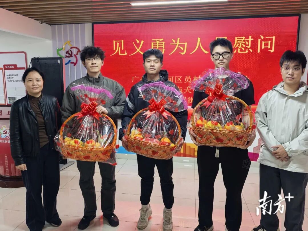 12月25日,天河区员村街道天福社区居委会给三人送上果篮进行了慰问。社区党总支书记、居委会主任蔡燕表示,社区还将协助三人申请见义勇为认定,以弘扬社会正气。