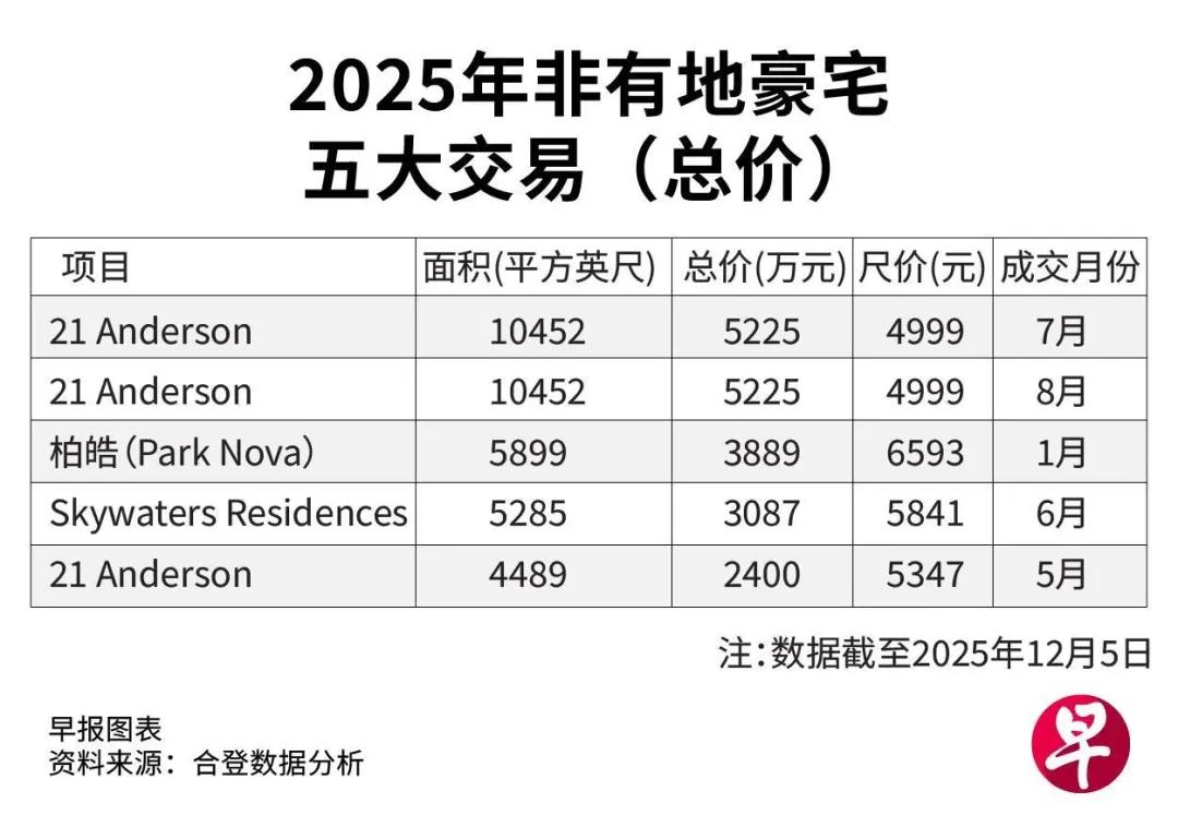 合登数据分析为《联合早报》整理的数据显示,截至12月5日,五大豪宅成交价中,21 Anderson便占了三席,其中两笔的成交价更是排在前二。今年7月与8月,两个1万零452平方英尺的单位分别以5225万元出售,尺价达4999元。