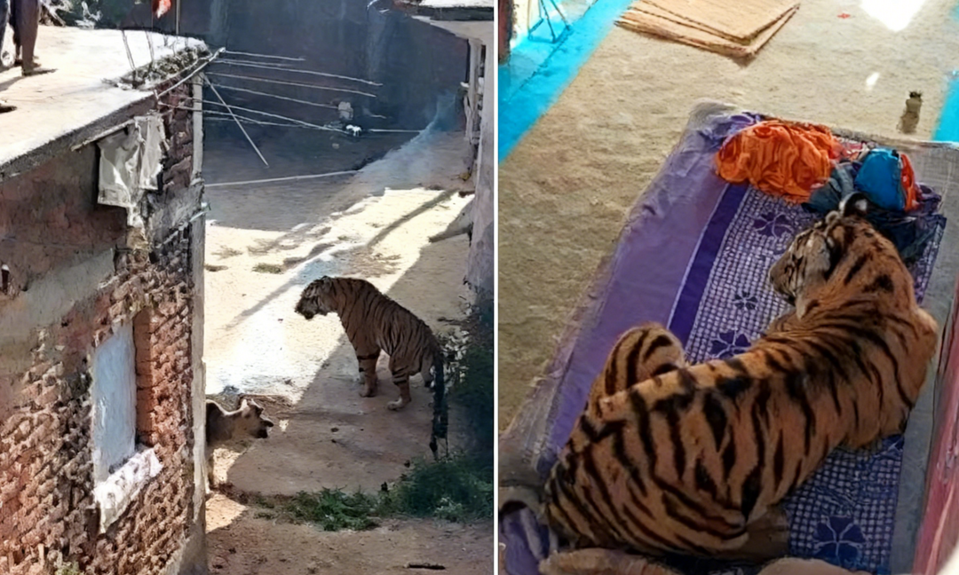 据印度电视台NDTV报道,这只老虎于29日上午10点左右沿田地进入村庄。它闯入村内后迅速扑倒一名青年男子,造成其腿部严重受伤,伤者已被紧急送往医院救治。袭人后,老虎径直闯入一户村民家中,直接坐在屋内床上,这一幕让现场陷入极度恐慌,多名村民为避险纷纷爬上屋顶。
