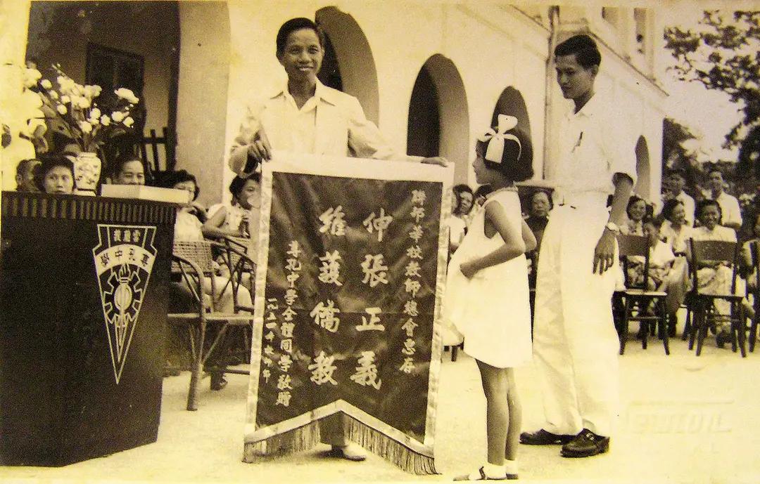 1954年,吉隆坡尊孔学校庆祝教师节,全体同学向教总赠送锦旗,林连玉接领锦旗。图源:马来西亚华社研究中心