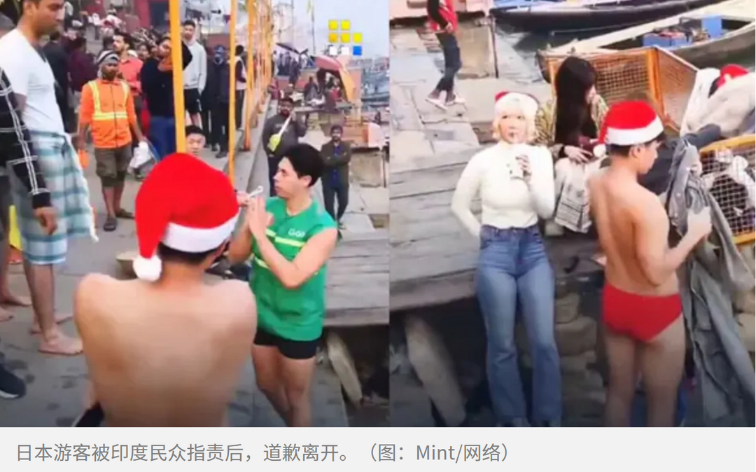 事发当天,这几名日本游客脱去外衣,头戴鲜红圣诞帽,兴致勃勃地准备在瓦拉纳西恒河段下水畅泳。网上流传的现场影片显示,此举瞬间触怒了视恒河为“母亲河”的当地教徒,大批居民迅速上前阻拦并将游客包围,现场情绪激动。