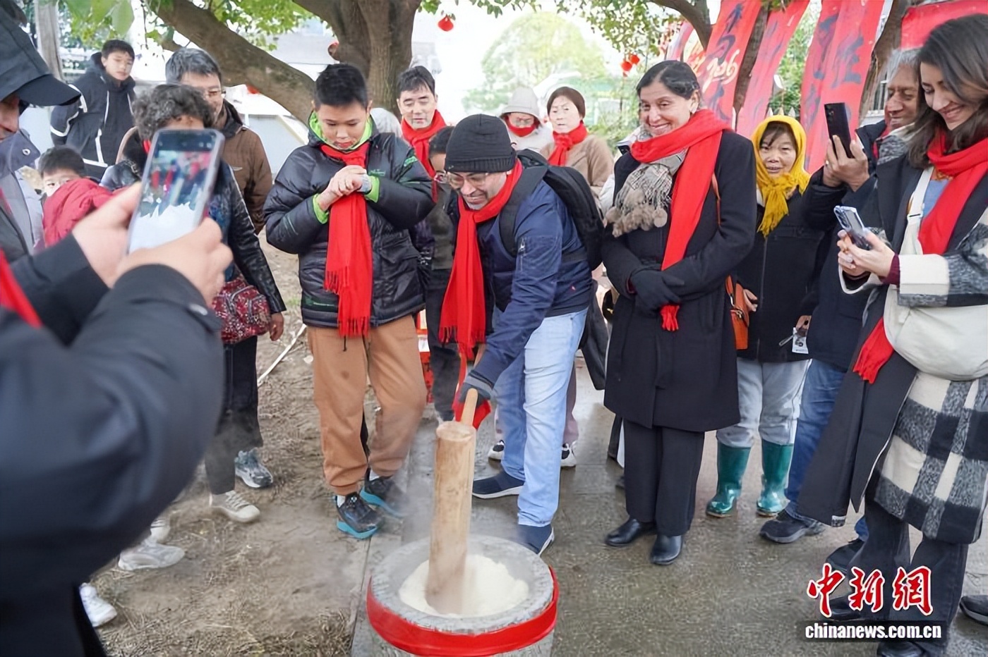 现场,这份热闹里还融入了不少异国面孔。来自意大利、英国、伊朗、俄罗斯、印度等国家的游客们兴致勃勃地观看舞龙表演,为翻腾的龙身与铿锵的锣鼓喝彩,还亲手体验了打年糕的力道与节奏,感受糯米的绵软与香甜。文化在体验中被理解,友谊在交流中悄然生长,这一幕,成为“团圆”与“共享”的国际化表达。