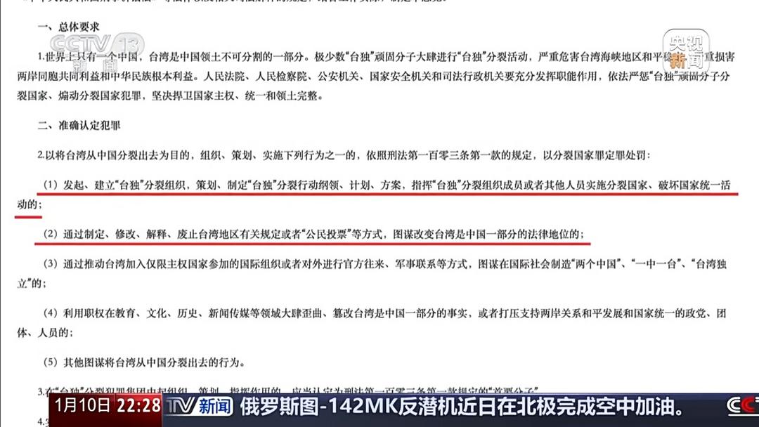 中央民族大学台港澳研究中心主任 田飞龙:之前国台办在关于“台独”分子的定义上,采用的是清单机制。在2021年 2022年都有公布清单,但是到2024年的时候,我们明确在司法解释当中定义了,什么叫“台独”顽固分子。比如说,迫害岛内爱国统派、勾结外国势力、在岛内推动“台独”对抗两岸统一。