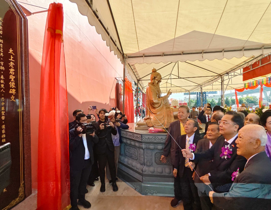 中新社曼谷1电 (李映民 刘宇博)庆祝中泰建交50周年暨老子铜像揭幕仪式11日在曼谷举行。此次活动由李氏宗亲总会举办,中国驻泰国大使张建卫、泰国文化部部长代表瓦拉潘专员,泰华社团代表、中泰及世界多国李氏宗亲代表逾800人出席仪式。