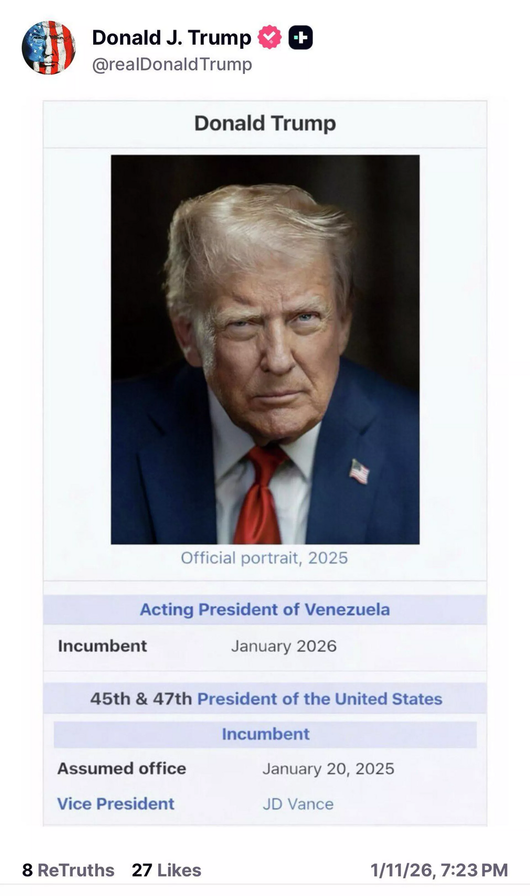 特朗普11日晚在“真相社交”发帖,自称“委内瑞拉代总统”。目前委内瑞拉方面对此暂无回应。