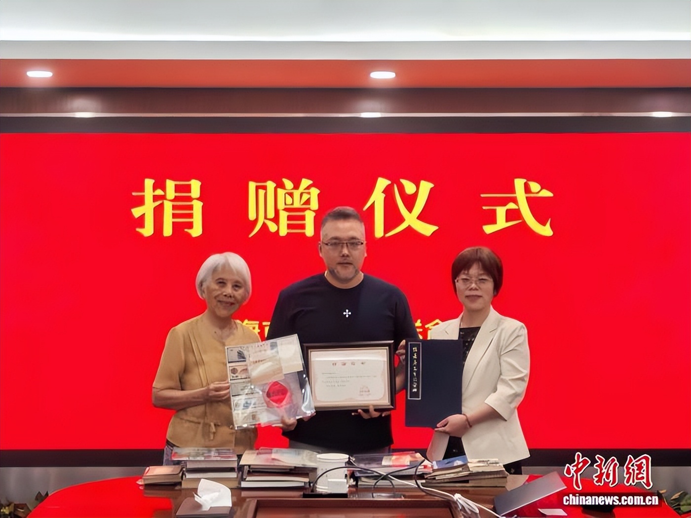 2025年,陈杨(中)向上海市侨联捐赠首批120余件侨史文物。 (受访者供图)