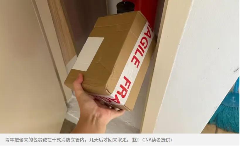 一名19岁青年利用居民将包裹放在组屋单位外的习惯,多次到不同组屋逐层“物色目标”,将偷来的包裹藏进**干式消防立管(dry riser)**内,过了几天才回头取走,再转卖、送人或自用。