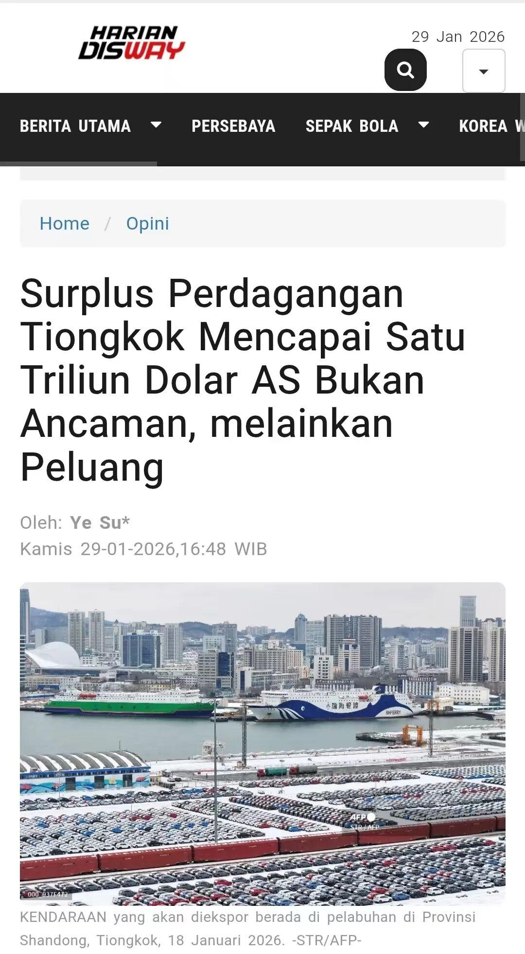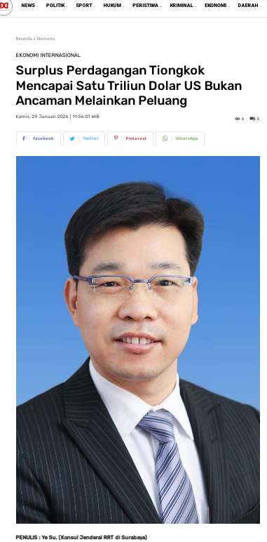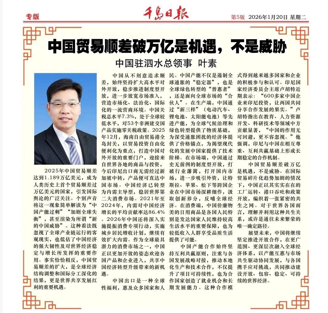 1月20日、29日,驻泗水总领事叶素在《千岛日报》、点滴网、《迪斯威日报》等印尼华文媒体和主流媒体发表题为《中国贸易顺差破万亿是机遇,不是威胁》署名文章。全文如下: