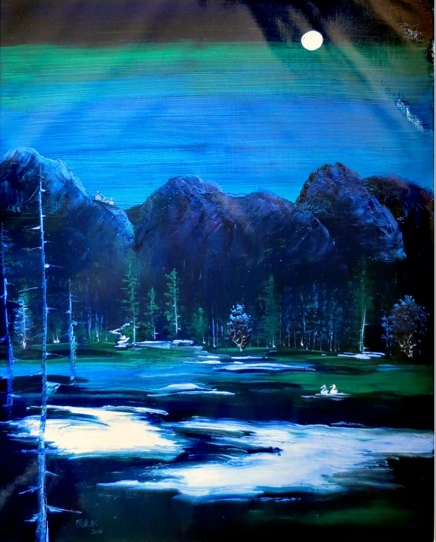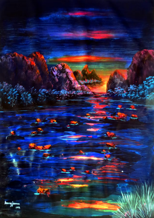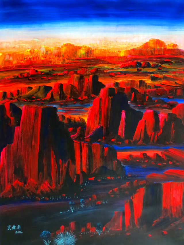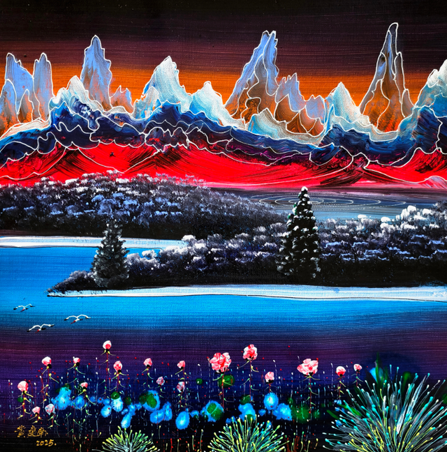黄建南的艺术之路,本身就是一部兼具坚韧与浪漫的史诗。年轻时,他以近乎苦行僧般的执着,徒步三万八千里,踏遍中国大江南北:在原始森林的葱郁中聆听自然的私语,在荒漠戈壁的辽阔中仰望星空的深邃,在名山大川的灵秀中汲取生命的力量。这段非凡的修行,为他日后的创作沉淀下磅礴大气的精神底蕴,也积蓄了喷薄欲出的艺术能量——当他执起画笔,那些藏于生命深处的感悟与热爱,便如火山喷发般倾泻而出,化作一幅幅震撼心灵的视觉奇观。