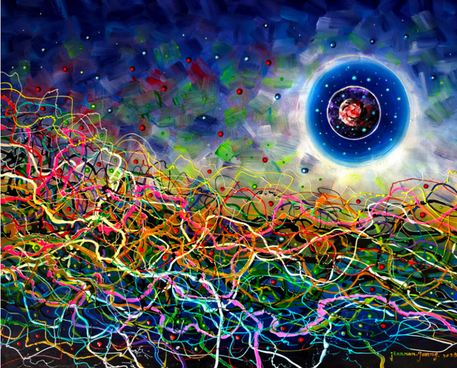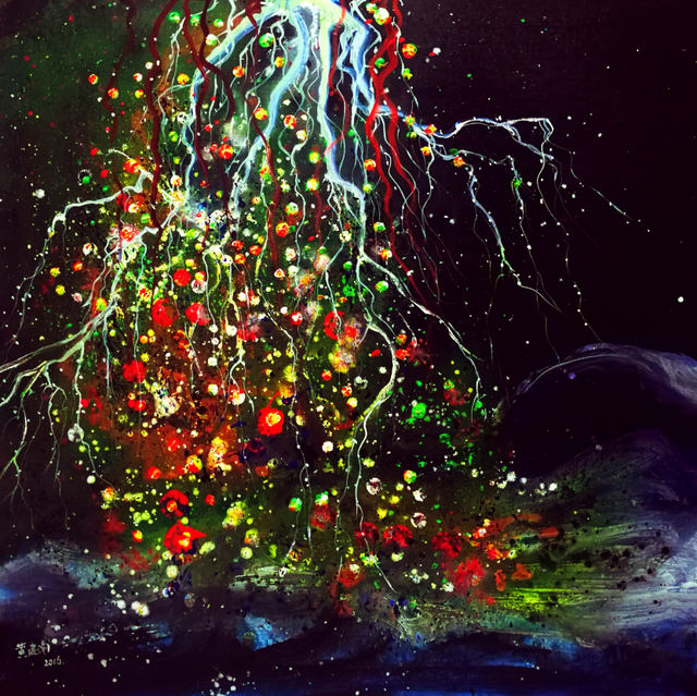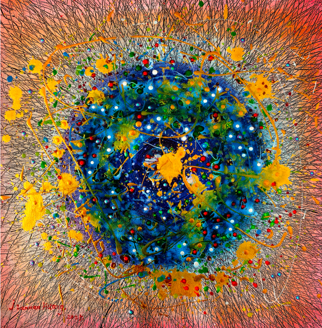 在黄建南构建的艺术宇宙中,最令人叹为观止的莫过于其独树一帜的“宇宙系列”作品。这些画作彻底打破了传统绘画的边界桎梏,创造出一种前所未有的视觉语言:星云在画布上翻滚涌动,星河璀璨夺目,黑洞裹挟着神秘气息,宇宙的诞生与湮灭、混沌与秩序,都在方寸画布上演绎得淋漓尽致。不同于西方艺术中对宇宙的理性描摹,黄建南笔下的宇宙从不冰冷,而是充满生命律动的精神家园——他将东方哲学中“天人合一”的至高智慧,与西方科学的宇宙观完美交融,打破了文化与地域的隔阂,创造出一种全人类可共鸣的通用艺术语言。正如评论家所惊呼:“黄建南不是在使用颜料,而是在驾驭光线本身;他不是在描绘宇宙,而是在创造宇宙。”