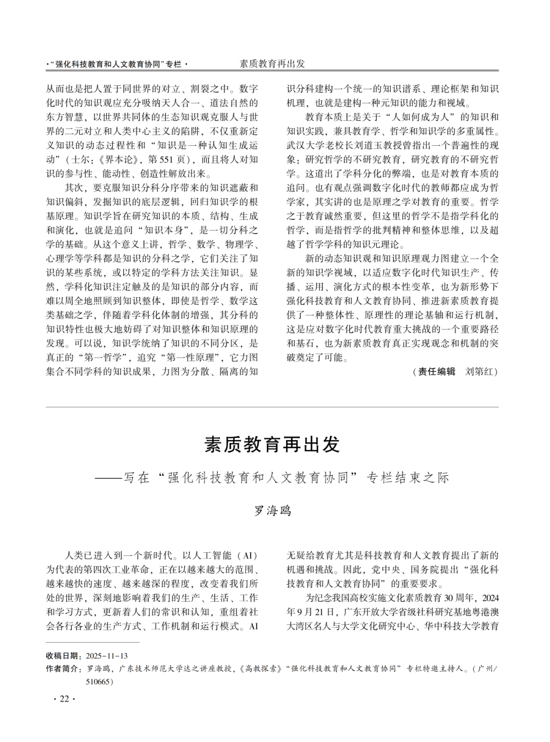 罗海鸥,广东技术师范大学达之讲座教授,《高教探索》“强化科技教育和人文教育协同”专栏特邀主持人。