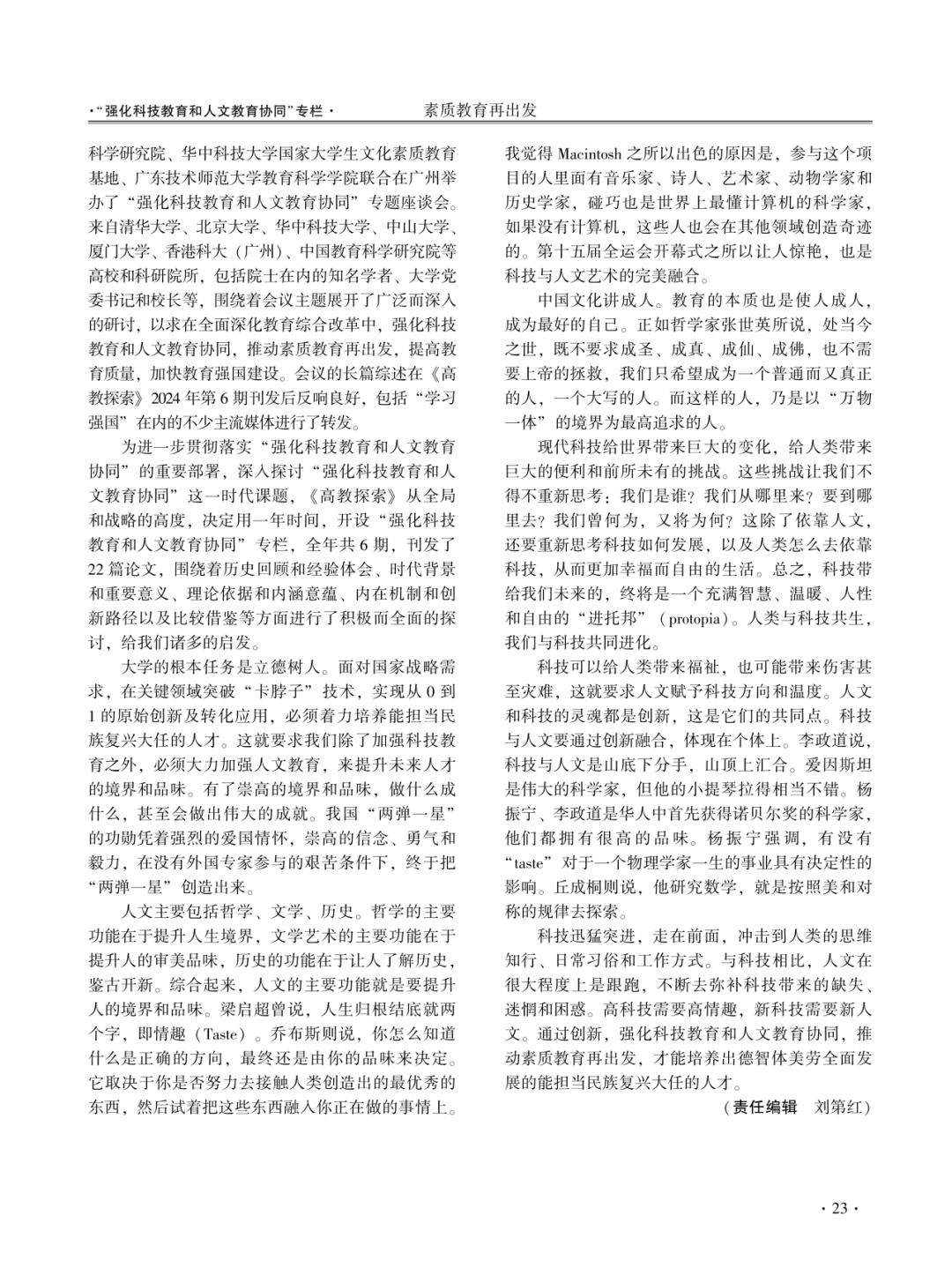 科技迅猛突进,走在前面,冲击到人类的思维知行、日常习俗和工作方式。与科技相比,人文在很大程度上是跟跑,不断去弥补科技带来的缺失、迷惘和困惑。高科技需要高情趣,新科技需要新人文。通过创新,强化科技教育和人文教育协同,推动素质教育再出发,才能培养出德智体美劳全面发展的能担当民族复兴大任的人才。