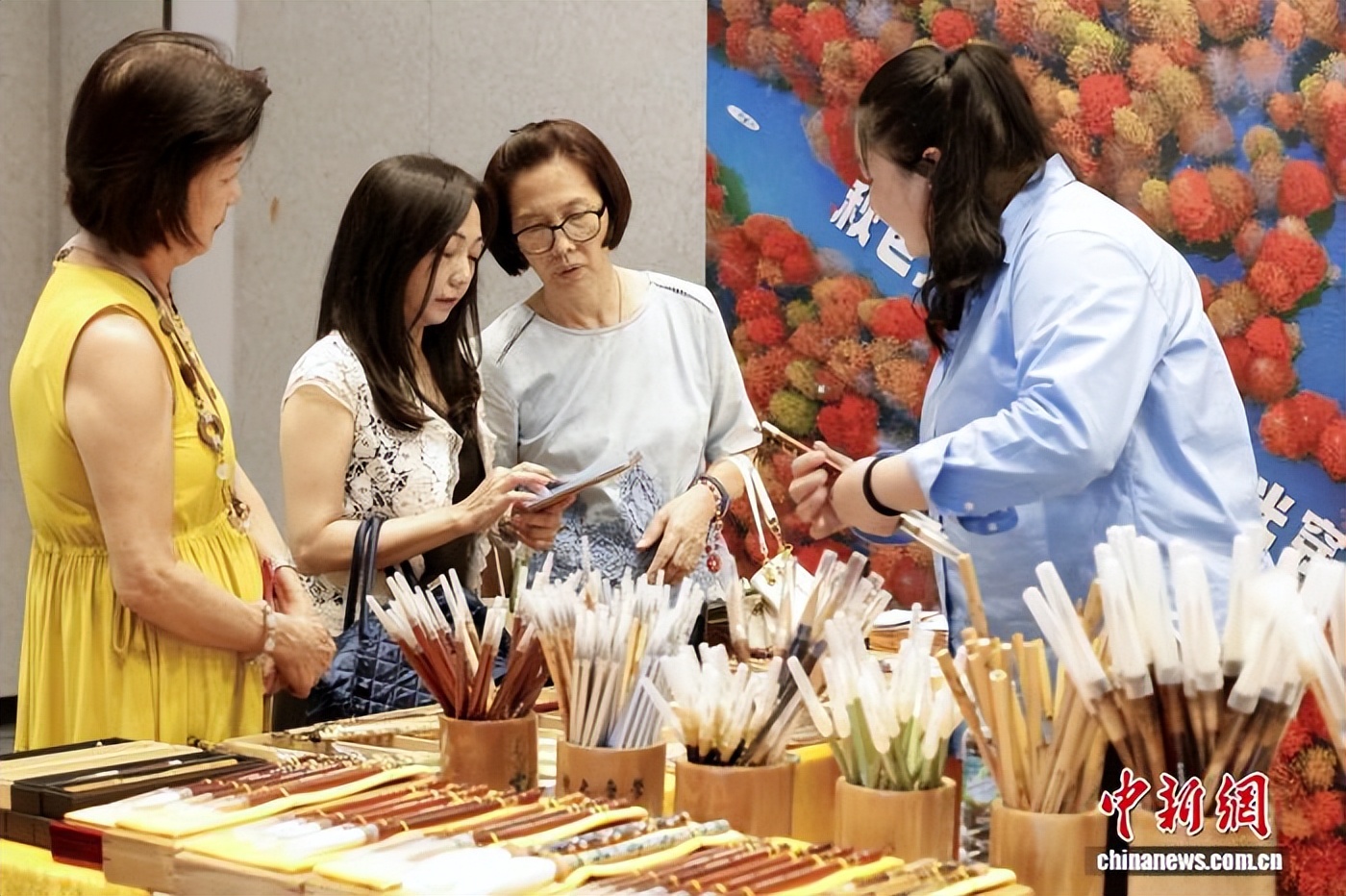 2月8日,“时代徽印”文房四宝博览会现场,游客在参观、购买宣笔。宣城市文化和旅游局供图