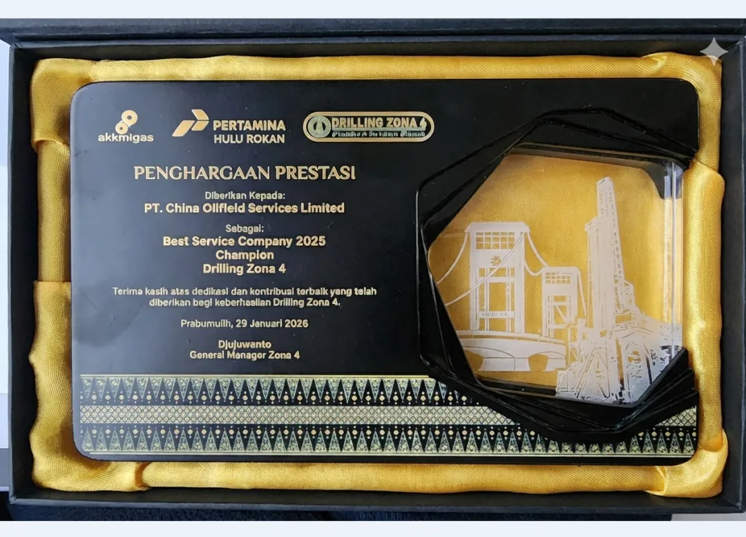 在本次评选中,印尼公司在多项关键指标上表现突出,综合评分位居前列,最终获得“最佳优秀服务奖”。该奖项充分体现了客户对中海油服固井技术服务能力和海外项目执行水平的高度肯定,也展现了油化项目团队过硬的专业素养和现场执行能力。