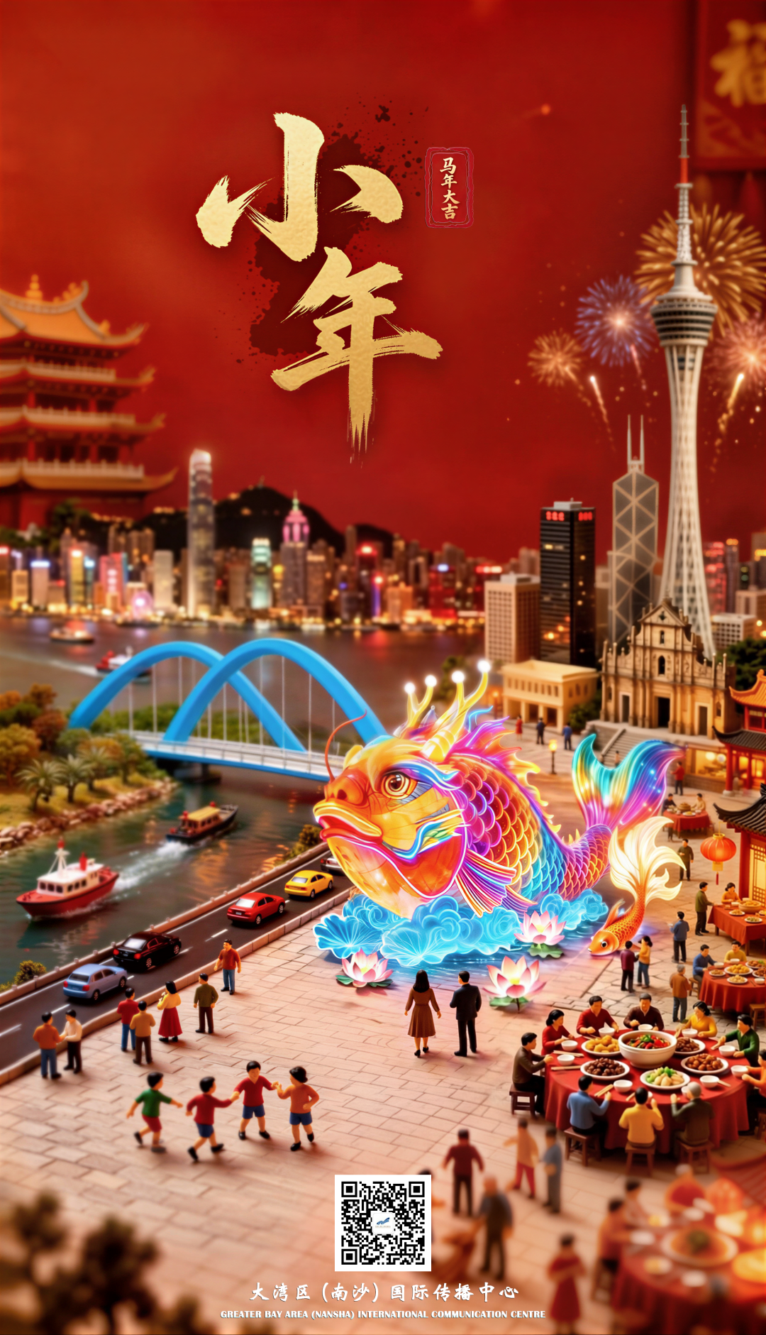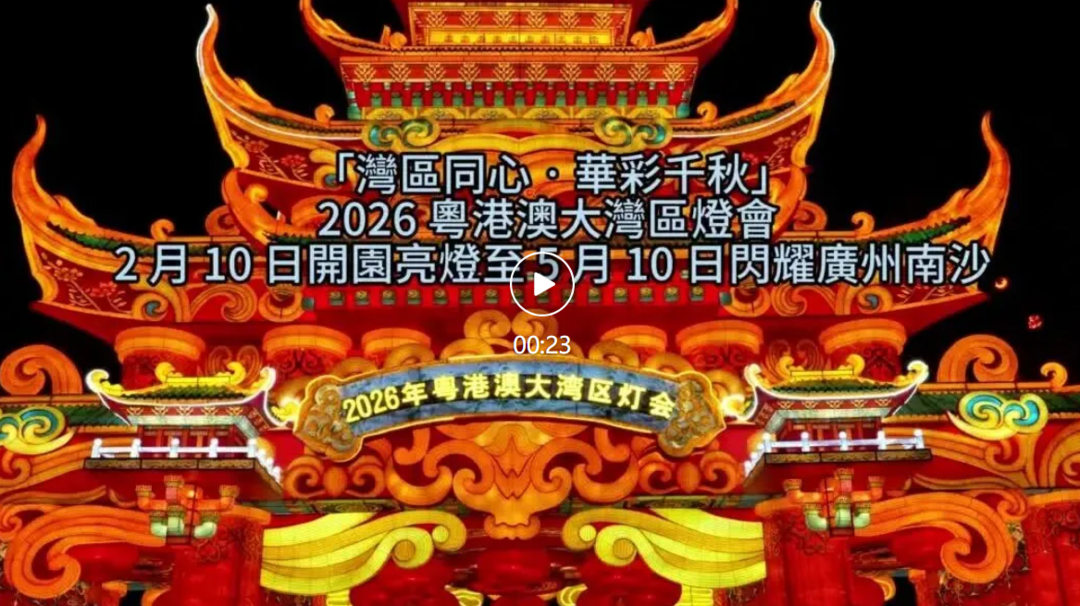 中國新聞聚焦粵港澳大灣區 小年夜,南沙灣:華彩千秋點亮灣區大未來 2026 年 2 月 10 日 2月10日,小年之夜(臘月廿三)。 廣州·南沙·天后宫 2026粵港澳大灣區燈會正式開園亮燈。 53萬平方米,百組大型燈景。 2.5公里主遊線路,1.3公里有軌小火車。 90天展期,5月10日結束。 歡迎四海賓朋,共賞灣區光影盛況。