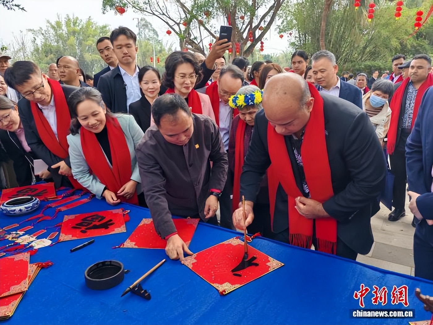 “我们春节前有写挥春的传统,贴在家里,以祈求新年好运。”有族亲介绍道。在书法家的邀请下,阿迪昂欣然提笔,熟练地写下两个大大的“福”字。