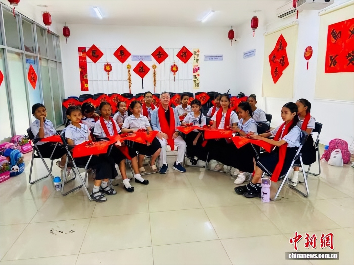 当地时间2月6日,冯利发到金边一所学校开展写春联、送祝福活动。(受访者供图)