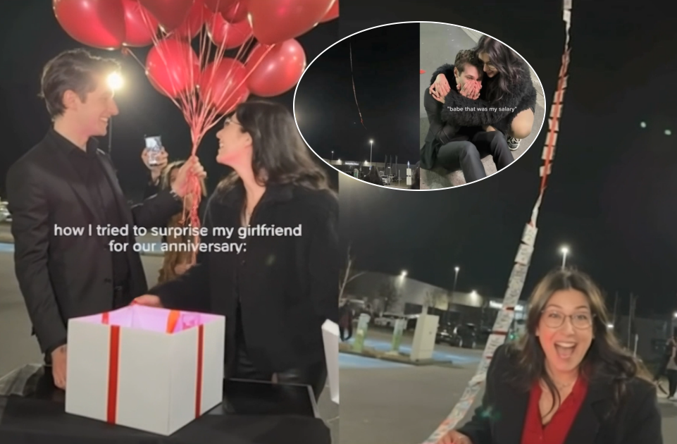 当女友兴奋地掀开盒盖时,气球带着闪亮的现金串缓缓升起。女友又惊又喜,当即转身与男友紧紧相拥,画面十分温馨。但就在两人甜蜜拥抱的下一秒,女友不慎松手,原本抓着的气球瞬间脱手,整串现金随气球直冲夜空。