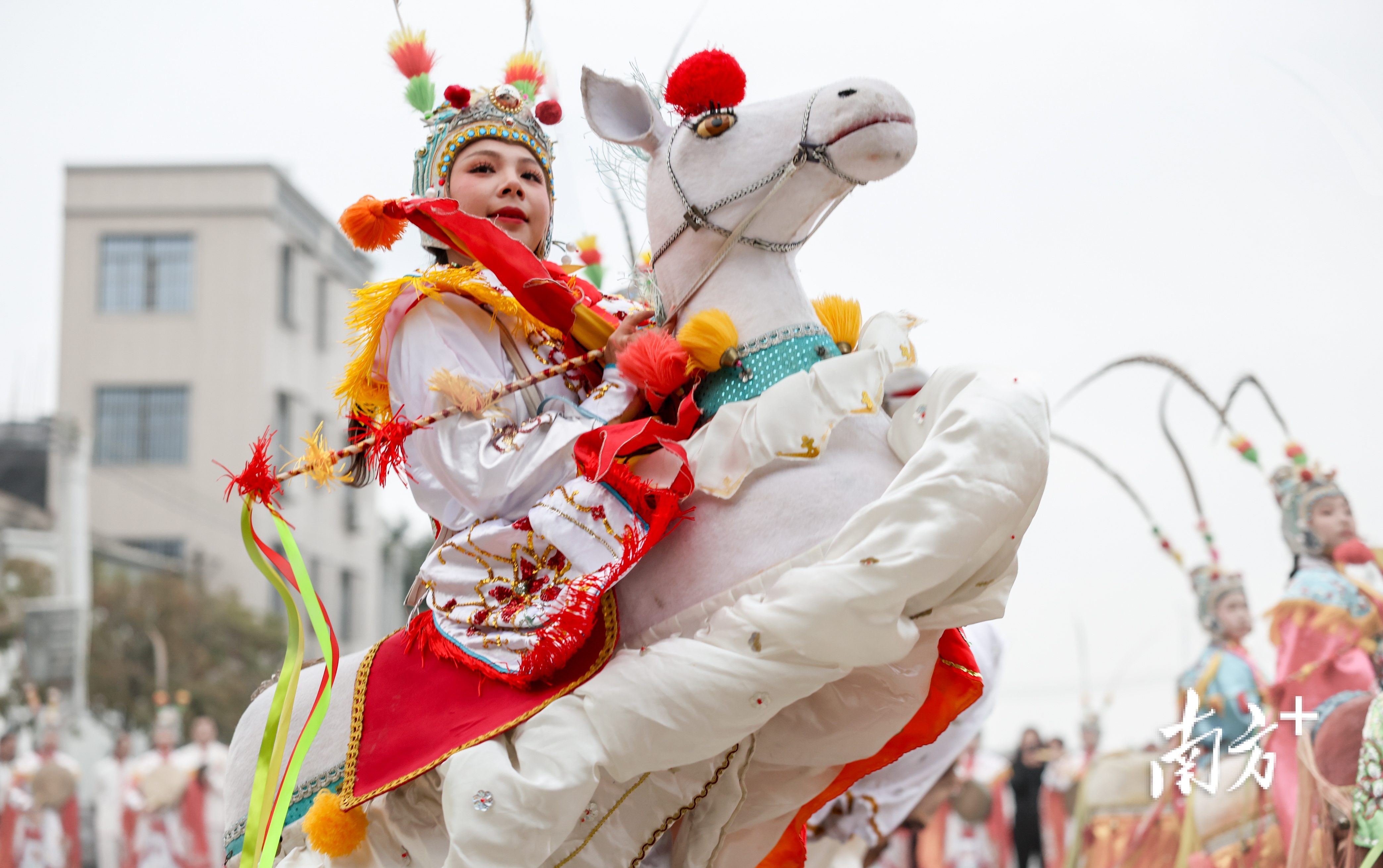 2月17日,大年初一一大早,潮州市饶平县黄冈镇霞西村,布马舞女骑士们策起马来,英姿飒爽。迎接巡游队伍的不仅有本地村民,不少外地人也慕名而来。