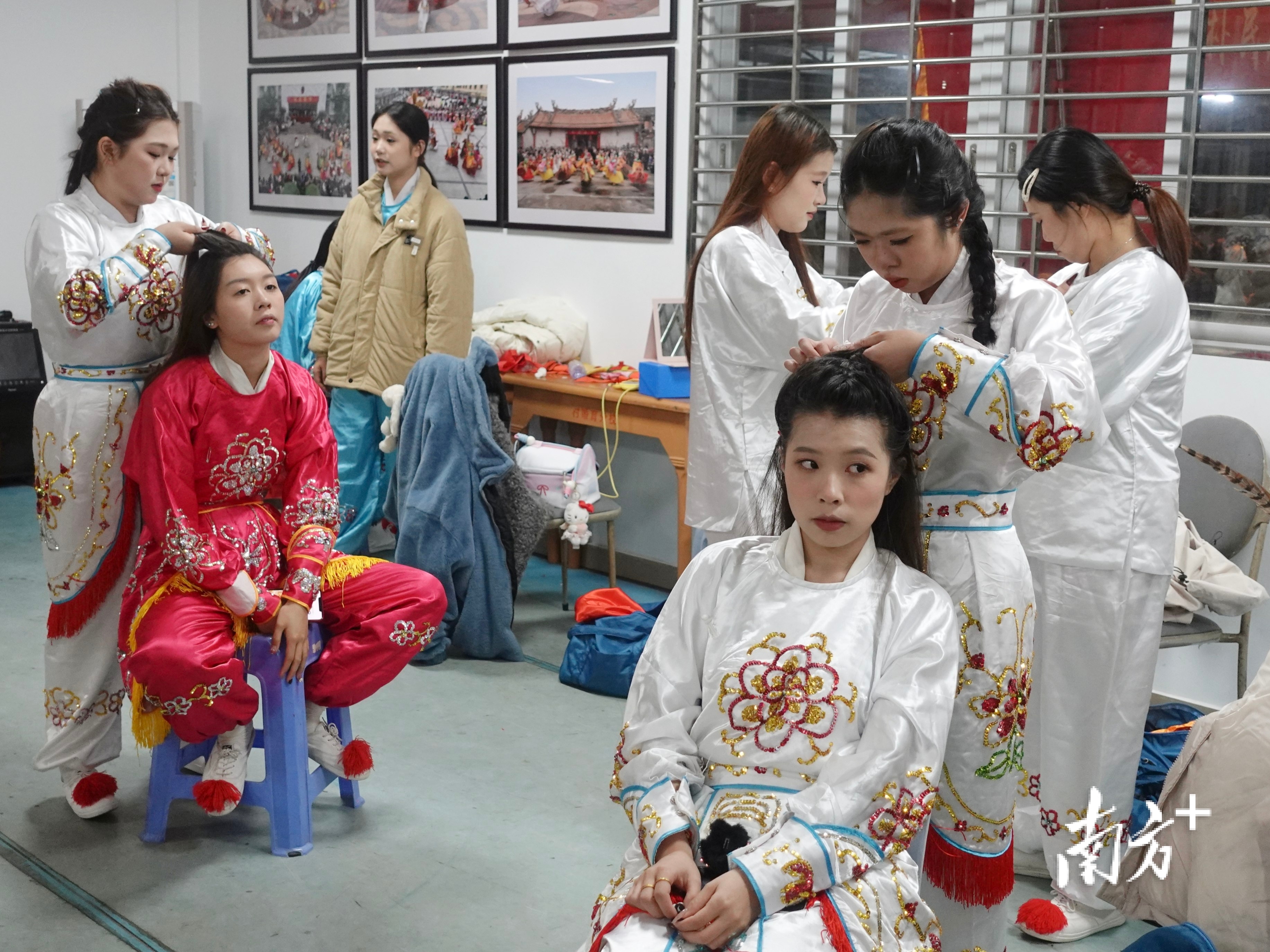 姑娘们互相帮着装扮,以最好的面貌迎接新春巡游。