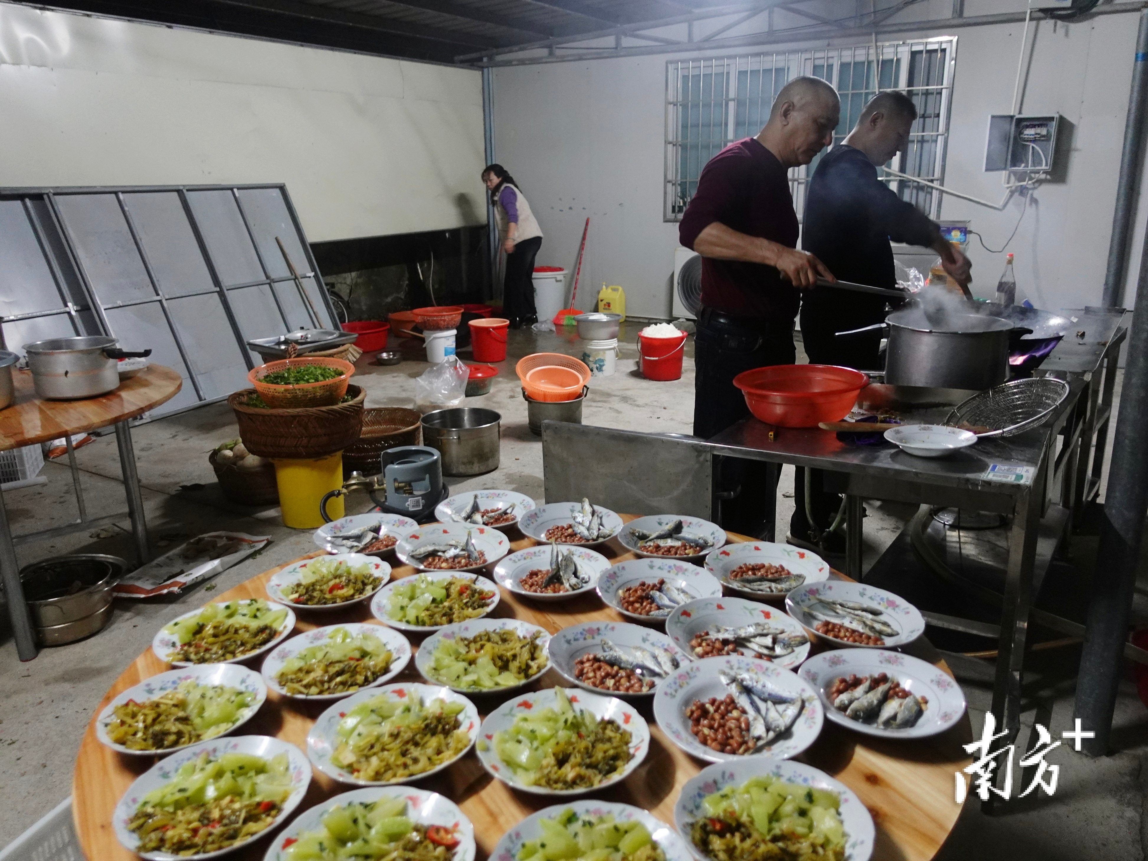 “吃饭啦!”室外空地上,白粥小菜摆满一桌,腐乳炒饭和西洋菜生蚝汤则用大锅装好放在地上。队员们或站或蹲,吃上了农历新年第一顿早饭。