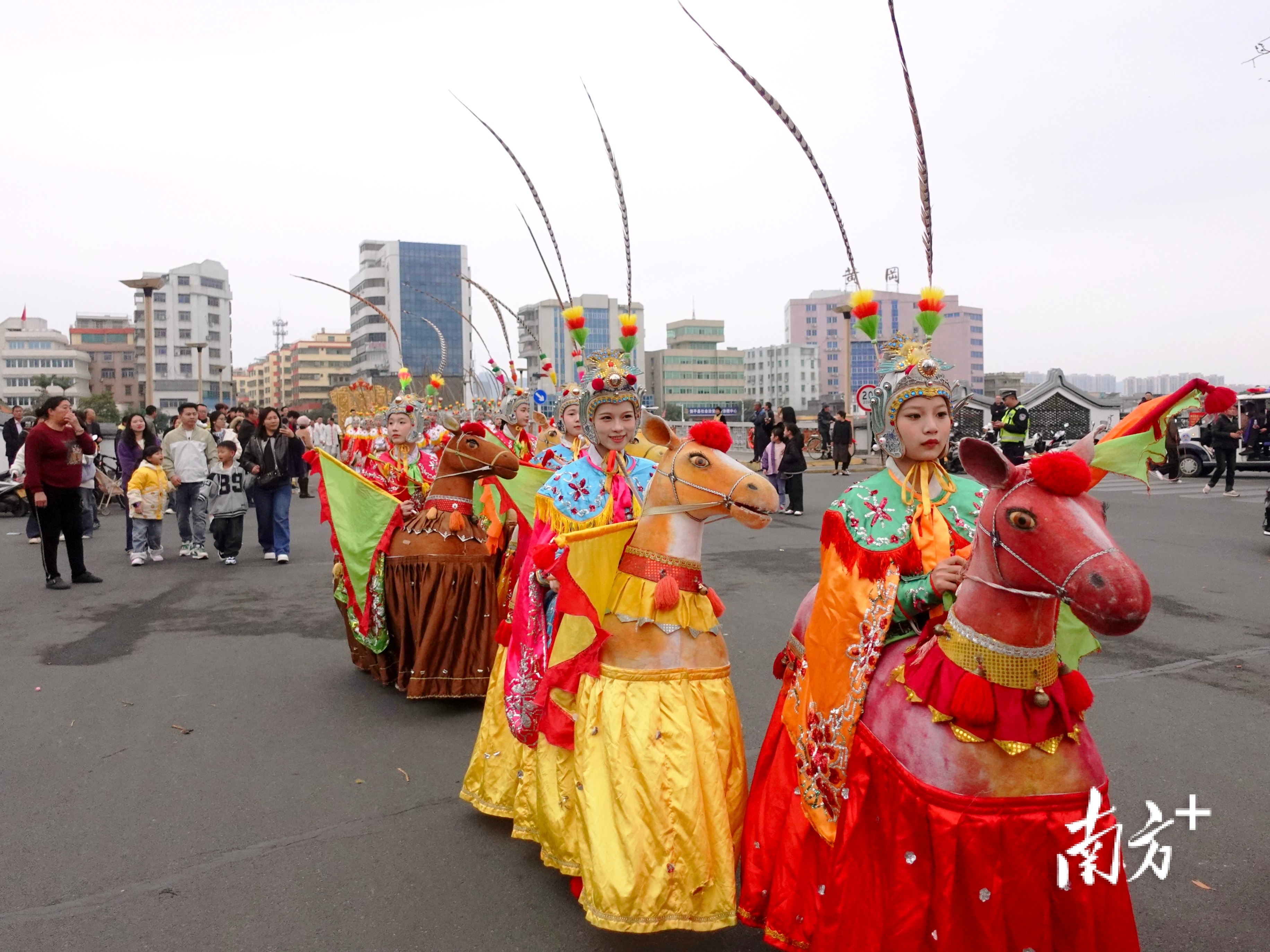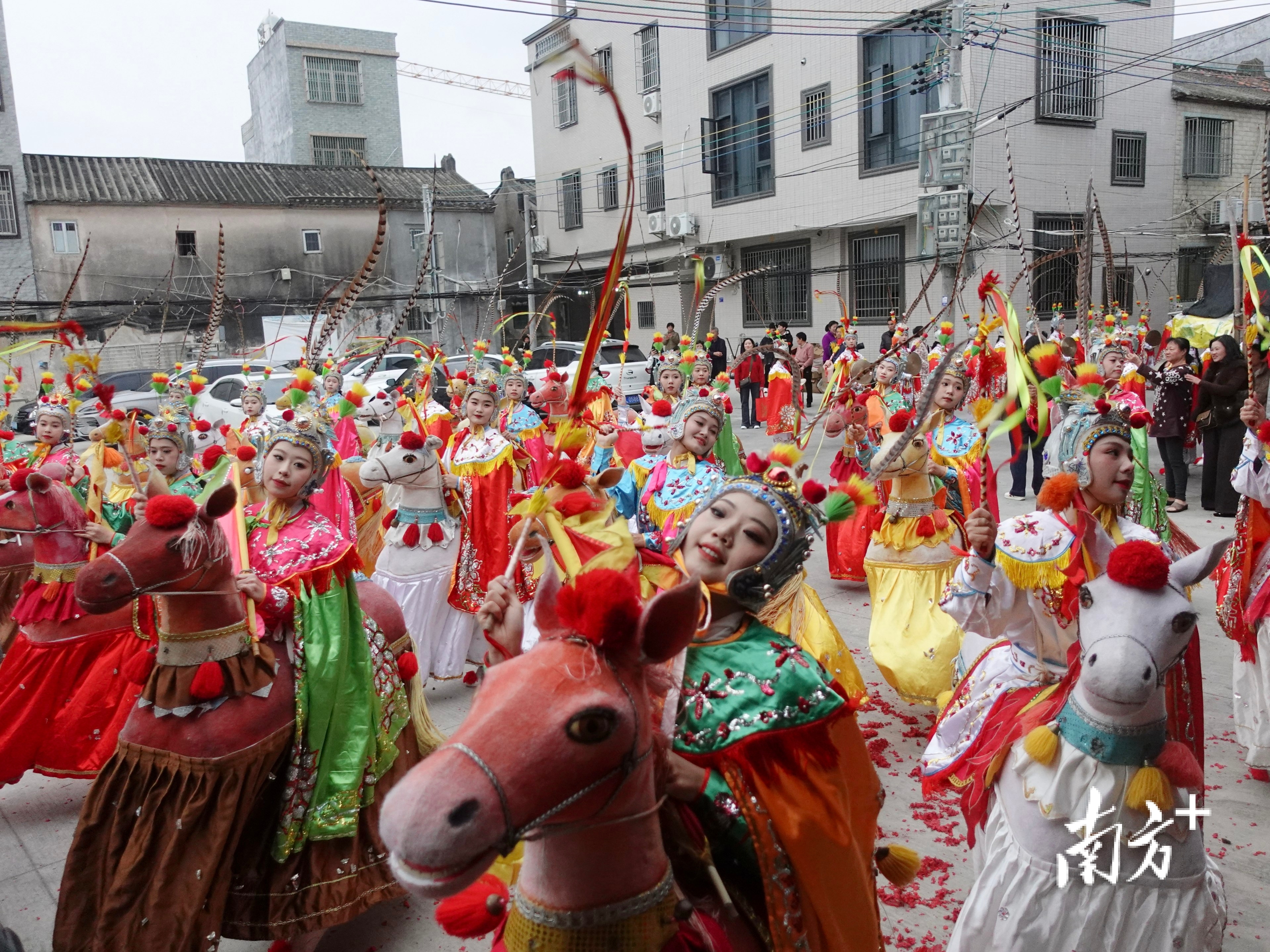 2月17日,大年初一一大早,潮州市饶平县黄冈镇霞西村,布马舞女骑士们策起马来,英姿飒爽。迎接巡游队伍的不仅有本地村民,不少外地人也慕名而来。