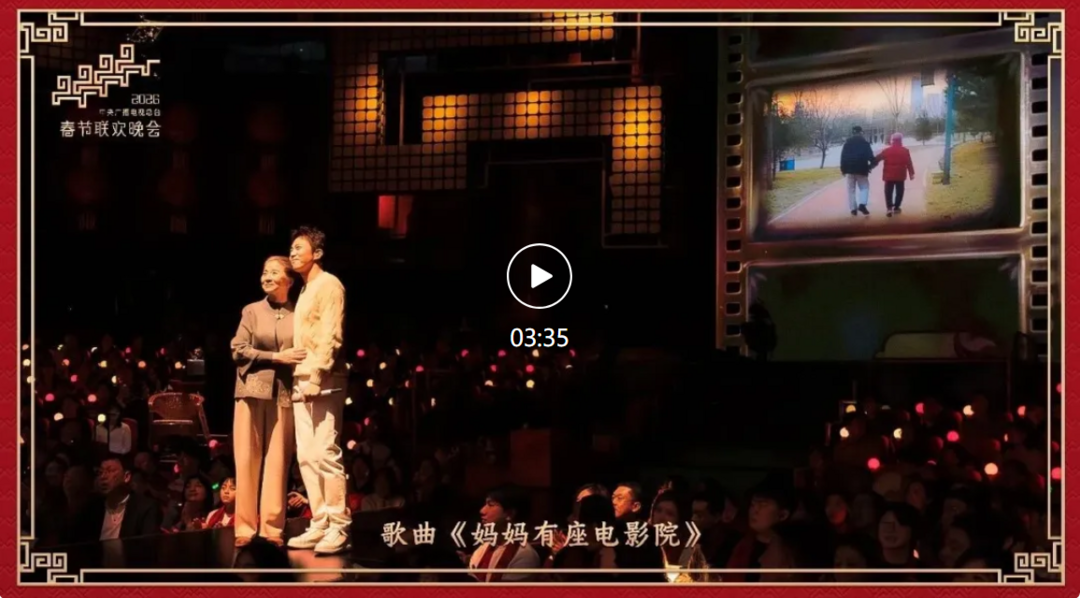 在春晚歌曲类节目负责人张异凡看来,把百姓画面作为节目的主体表达,是“人民的春晚”契合新大众文艺的又一方式。节目为此减少了歌手与演员的近景,只在关键节点串联母与子、放映员与观者的双重叙事。从《拼音》到《住在心里的人》再到《妈妈有座电影院》,每年春晚总会用几首歌的时间,把百姓生活的影像带进1号厅再带给千家万户,这本身,就是与人民共创的过程。
