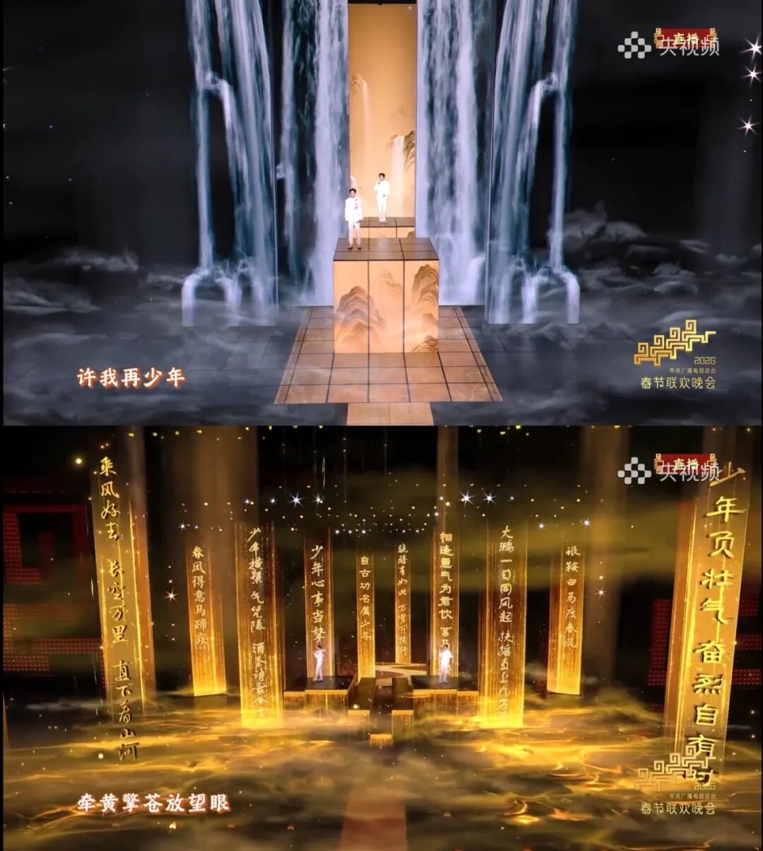 高山流水间,《许我再少年》是少年意气凌云再现。经总台台长提示,导演组将背景的古典诗句从追忆往昔的暮年诗篇,替换为诗人的年少名作。儿时壮志顶天立地,青山依旧在,少年也初心不改。