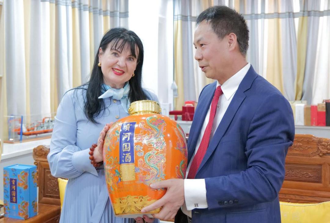 叶志聪赠予Alla Yesypenko博士(左一)贡河国酒